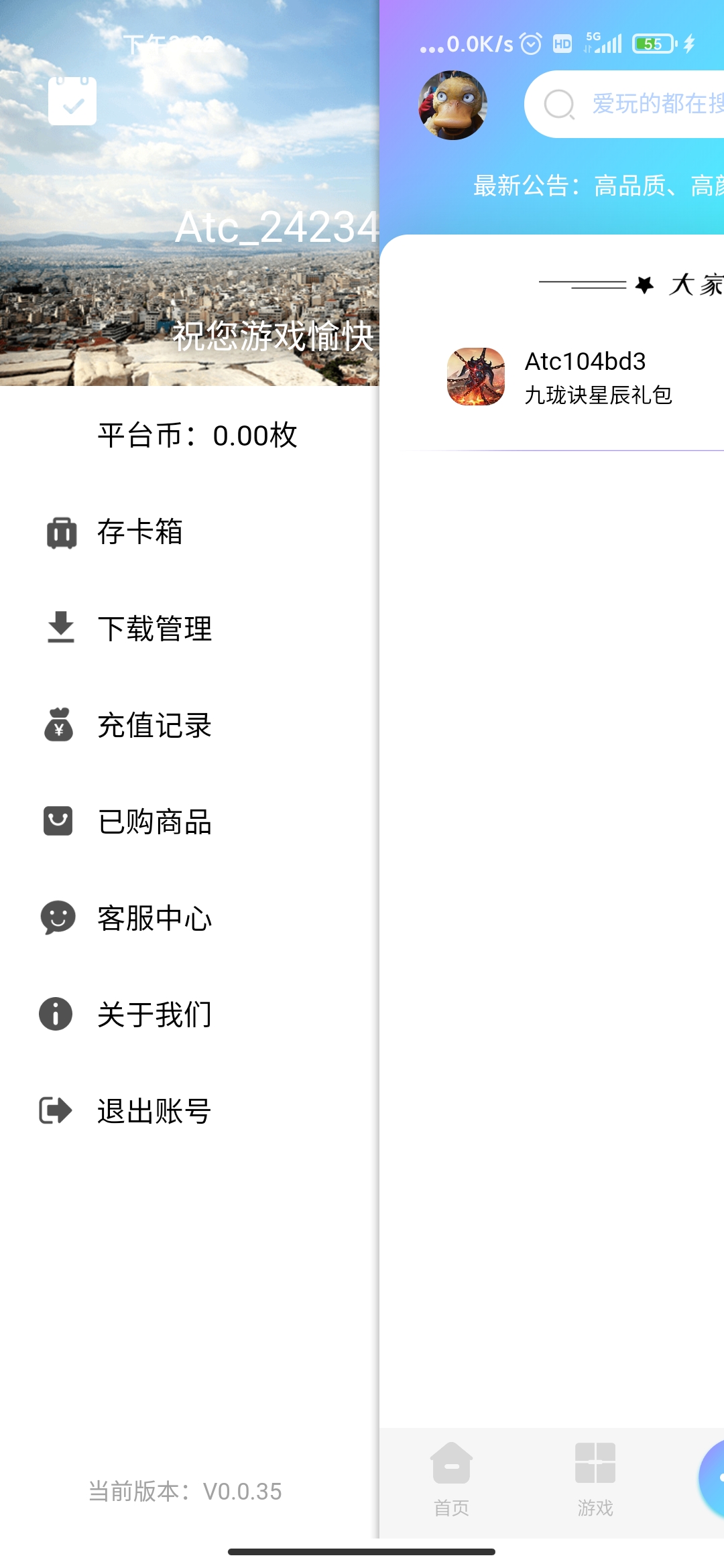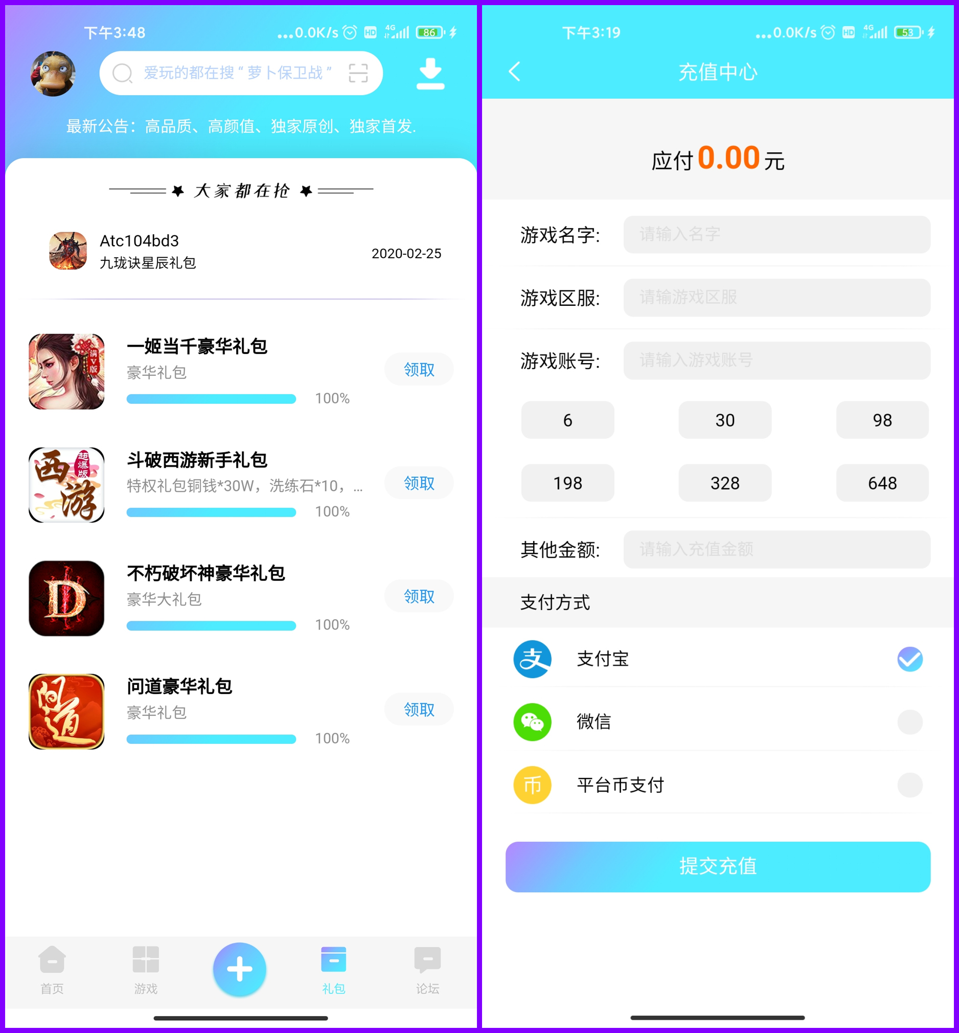 注意本APP非sdk,不自带任何游戏,本演示内的游戏均为网上游戏素材,所有游戏、礼包、资讯、交易账号、任务发布内容需要自行后台上传管理如需APP内充值,需要自行申请第三方支付接口,不需要充值功能可以关闭